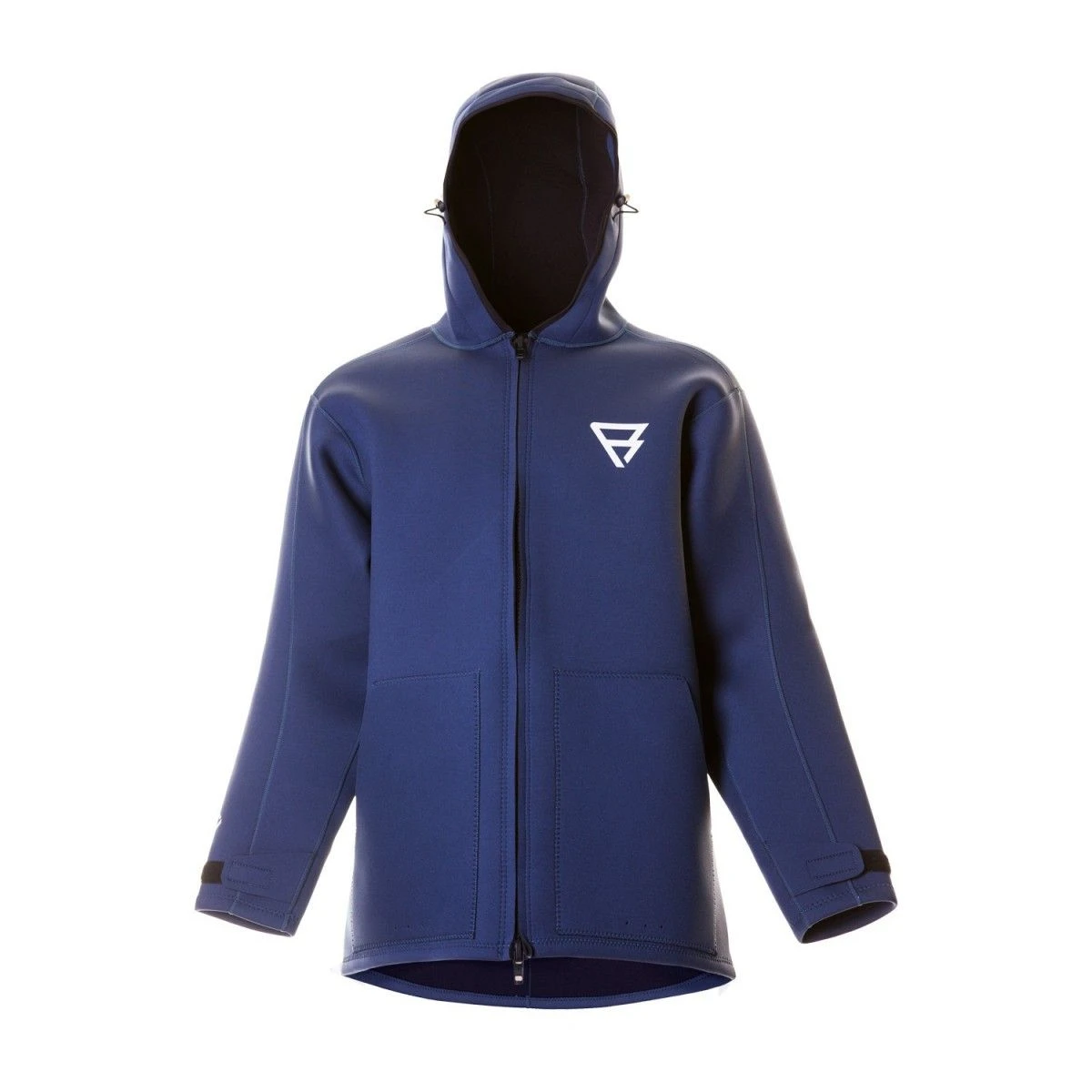 Neopren overtræksjakke til at bære over våddragten. Simple lommer og med en hue, der kan reguleres.